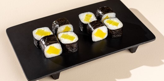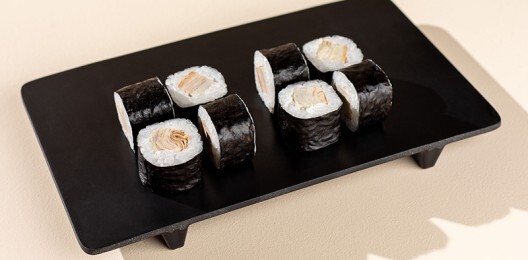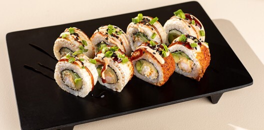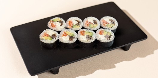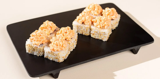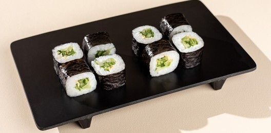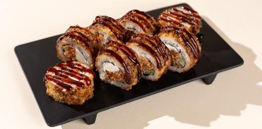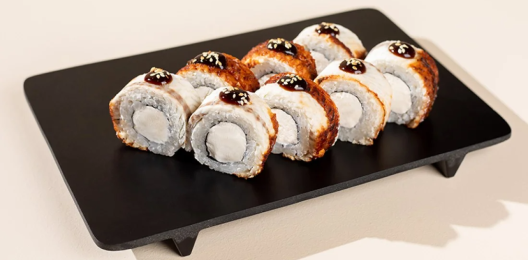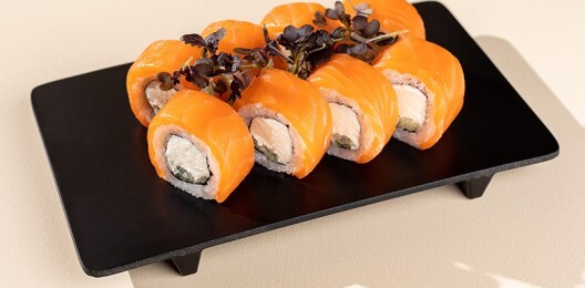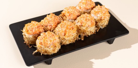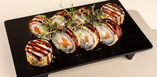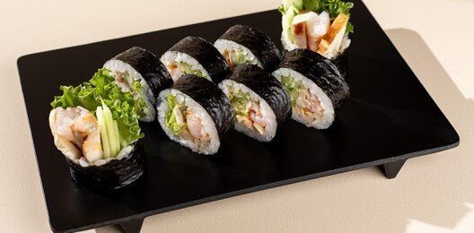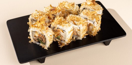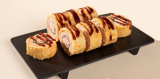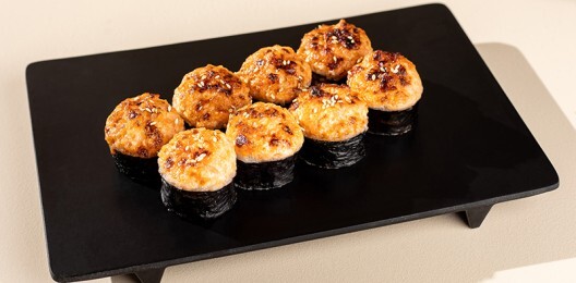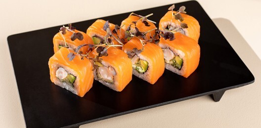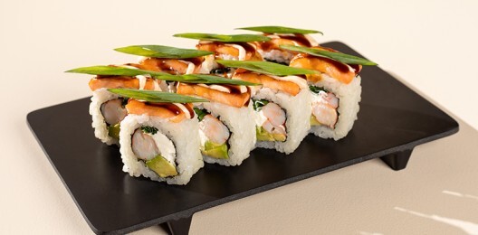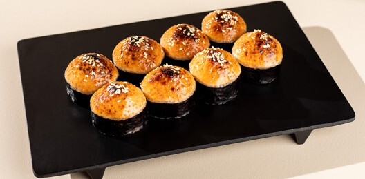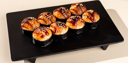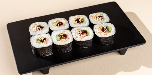 Угорь, огурец, креметте, рис, нори, соус "Яки" с добавлением шиитаке и чеснока, соус "Унаги", кунжут белый. *Возможно попадание мелких косточек в угре!